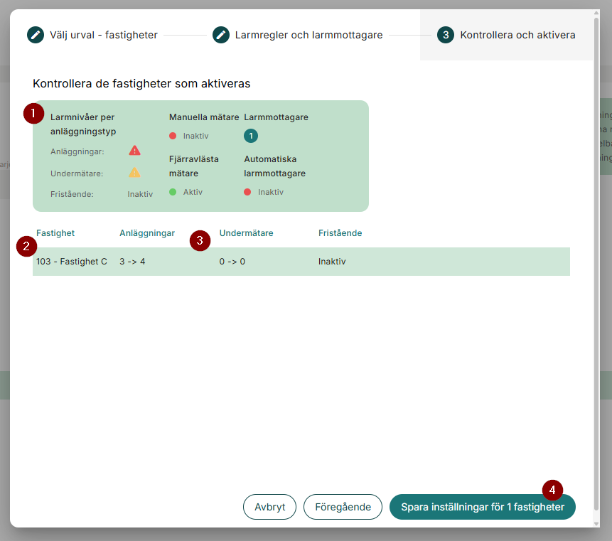 Sista steget är "Kontrollera och aktivera", här får du kontrollera att dina val stämmer innan du slutligen väljer att Spara inställningar för x antal användningstyper och aktivera larmen på valda anläggningar.