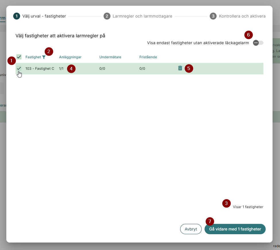 Knappen för att ta sig vidare till val av Larmregler och Larmmottagare "Gå vidare med x fastigheter" visar det antal fastigheter du har markerat i listan.